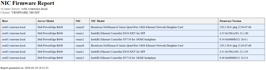 To streamline this task, I wrote a PowerShell script that retrieves the NIC firmware versions for each host in a VMware cluster. Using PowerCLI, the script collects: